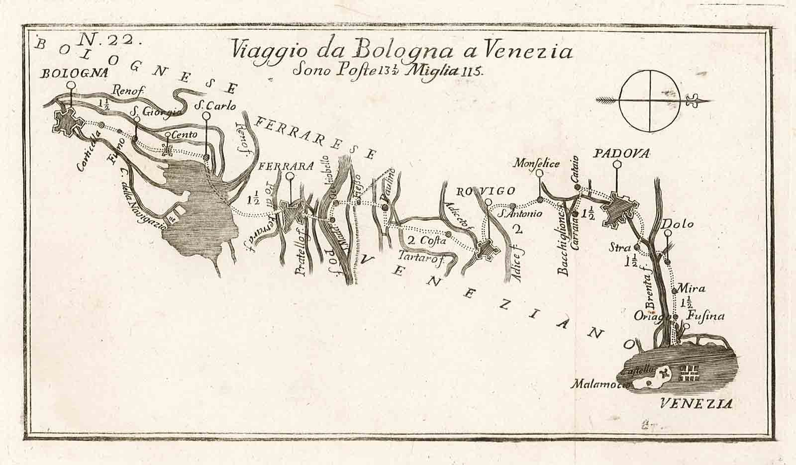 Itinerario raffigurante il percorso stradale con evidenziati castelli, città e stazioni postali tra cui Cento, Ferrara, Rovigo, Monselice, Padova, Dolo