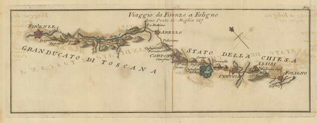 Viaggio da Firenze a Foligno passando per Bagno, Apparita, Pian della Fonte, Incisa, Figline, M. Varchi, Levane, Laterina, P. Buriano, Arezzo, Pulicciano Castiglione Fiorentino, Cortona, Passignano, Torricella, Perugia, Bastia, Assisi e Madonna degli Angeli. Pieghe editoriali, coloritura coeva
