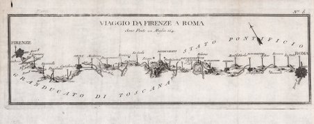 Carta itineraria tratta dalla celebre Direzione pe' viaggiatori in Italia colla notizia di tutte le poste, e i loro prezzi. Terza edizione Ricorretta nelle Poste cambiate, ed accresciuta dopo la prima. Dedicato al Nobilissimo Cavaliere il signor marchese Giuseppe Zagnoni. Direction pour les voiageurs en Italie avec la notice des touttes les postes, et leurs prix di Carlo Barbieri, stampata per la prima volta a Bologna da Giovanni Battista Sassi, nel 1771. Nella seconda metà del Settecento, il bolognese Carlo Barbieri, in una sua fortunatissima guida postale, organizza tutti gli itinerari italiani addensandoli esclusivamente intorno alle strade che portano a Bologna. Una guida fortunatissima, di cui si contano almeno venti edizioni nel corso dell'ultimo trentennio del Settecento. Acquaforte, in buono stato di conservazione. Carta itineraria tratta dalla celebre Direzione pe' viaggiatori in Italia colla notizia di tutte le poste, e i loro prezzi. Terza edizione Ricorretta nelle Poste cambiate, ed accresciuta dopo la prima. Dedicato al Nobilissimo Cavaliere il signor marchese Giuseppe Zagnoni. Direction pour les voiageurs en Italie avec la notice des touttes les postes, et leurs prix di Carlo Barbieri, stampata per la prima volta a Bologna da Giovanni Battista Sassi, nel 1771. Nella seconda metà del Settecento, il bolognese Carlo Barbieri, in una sua fortunatissima guida postale, organizza tutti gli itinerari italiani addensandoli esclusivamente intorno alle strade che portano a Bologna. Una guida fortunatissima, di cui si contano almeno venti edizioni nel corso dell'ultimo trentennio del Settecento. Acquaforte, in buono stato di conservazione. Cfr.