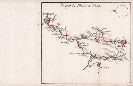 Rara carta itineraria manoscritta raffigurante i possibili viaggi della Toscana alla fine del XVIII secolo ove sono raffigurati i dettagliati percorsi con strade, Paesi, Chiese e Vicariati le Poste e i Castelli, finemente eseguita a china e colorata all'acquerello. Eseguita da Antonio Giachi, Firenze, circa 1760. A partire dalla seconda metà del ‘700 le guide postali vivono un periodo di grande diffusione grazie a John Ogilby con l’opera “Britannia” edita per la prima volta a Londra nel 1674, egli inventa il modello a “strisce”, la mappa inserita nel libretto infatti riporta la rappresentazione del singolo percorso da una città all’altra, con le tappe intermedie, e ricorda molto da vicino le carte della moderna metropolitana, una raffigurazione lineare ed essenziale ma di chiara e immediata lettura e comprensione. In Italia il modello a strisce risale ad una famiglia di cartografi - Giachi di Arezzo - che a partire dal 1740 circa, ebbero una bottega a Firenze “in via Lambertesca” e per due generazioni produssero moltissime carte itinerarie e libretti di viaggio esclusivamente manoscritti, pur in controtendenza rispetto alla moda dello stampato e alle esigenze del tempo, e ciò comportava una produzione decisamente minore, ma confezionata a misura del cliente. Di questa famiglia di cartografi - Luigi Giachi e i figli Antonio e Francesco - non si hanno molte notizie; si sa solo che furono funzionari tecnici, tra gli anni 50 e 90 del ‘700, al servizio dell’amministrazione Lorenese come agrimensori e disegnatori/copisti. Furono autori di un nutrito gruppo di atlanti e raccolte relativi alle oltre 40 province vicariali, o ai circondari comunali in cui era suddiviso il Granducato. Poco si può dire sulla produzione individuale di ciascuno di loro, se non per la firma che talvolta compare in alcune opere. Di Francesco le attribuzioni sono molto poche mentre di Luigi sappiamo che era stabilmente al servizio del granduca Pietro Leopoldo e Ferdinando III. Di Antonio invece sappiamo che fu autore di atlanti contenenti la serie di carte relative alle circoscrizioni giudiziarie della Toscana negli anni prima del 1772. La collezione Giachi, conservata e digitalizzata dalla Biblioteca Nazionale di Firenze, comprende 132 carte manoscritte realizzate nel 1780 rappresentanti diversi siti della Toscana. Le carte attengono a differenti tipologie cartografiche: carte di territori specifici come diocesi o vicariati, piante di città, piante di fortezze e castelli, vedute della costa o di paesaggi, carte rappresentanti i corsi dei fiumi (cfr. Moreni, Bibliografia storico-ragionata della Toscana, I, 425.) Rara carta itineraria manoscritta raffigurante i possibili viaggi della Toscana alla fine del XVIII secolo ove sono raffigurati i dettagliati percorsi con strade, Paesi, Chiese e Vicariati le Poste e i Castelli, finemente eseguita a china e colorata all'acquerello. Eseguita da Antonio Giachi, Firenze, circa 1760. A partire dalla seconda metà del ‘700 le guide postali vivono un periodo di grande diffusione grazie a John Ogilby con l’opera “Britannia” edita per la prima volta a Londra nel 1674, egli inventa il modello a “strisce”, la mappa inserita nel libretto infatti riporta la rappresentazione del singolo percorso da una città all’altra, con le tappe intermedie, e ricorda molto da vicino le carte della moderna metropolitana, una raffigurazione lineare ed essenziale ma di chiara e immediata lettura e comprensione. In Italia il modello a strisce risale ad una famiglia di cartografi - Giachi di Arezzo - che a partire dal 1740 circa, ebbero una bottega a Firenze “in via Lambertesca” e per due generazioni produssero moltissime carte itinerarie e libretti di viaggio esclusivamente manoscritti, pur in controtendenza rispetto alla moda dello stampato e alle esigenze del tempo, e ciò comportava una produzione decisamente minore, ma confezionata a misura del cliente. Di questa famiglia di cartografi - Luigi Giachi e i figli Antonio e Francesco - non si hanno molte notizie; si sa solo che furono funzionari tecnici, tra gli anni 50 e 90 del ‘700, al servizio dell’amministrazione Lorenese come agrimensori e disegnatori/copisti. Furono autori di un nutrito gruppo di atlanti e raccolte relativi alle oltre 40 province vicariali, o ai circondari comunali in cui era suddiviso il Granducato. Poco si può dire sulla produzione individuale di ciascuno di loro, se non per la firma che talvolta compare in alcune opere. Di Francesco le attribuzioni sono molto poche mentre di Luigi sappiamo che era stabilmente al servizio del granduca Pietro Leopoldo e Ferdinando III. Di Antonio invece sappiamo che fu autore di atlanti contenenti la serie di carte relative alle circoscrizioni giudiziarie della Toscana negli anni prima del 1772. La collezione Giachi, conservata e digitalizzata dalla Biblioteca Nazionale di Firenze, comprende 132 carte manoscritte realizzate nel 1780 rappresentanti diversi siti della Toscana. Le carte attengono a differenti tipologie cartografiche: carte di territori specifici come diocesi o vicariati, piante di città, piante di fortezze e castelli, vedute della costa o di paesaggi, carte rappresentanti i corsi dei fiumi (cfr. Moreni, Bibliografia storico-ragionata della Toscana, I, 425.) Cfr.