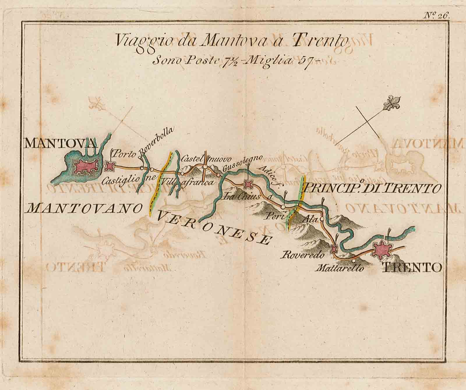 Stampa antica ed originale con viaggio da Mantova a Trento passando per Porto, Roverbolla, Castiglione, Villafranca, Castelnuovo, Gussolegno, La Chiusa, Peri, Ala Roveredo e Mattarello. Coloritura coeva, piega editoriale
