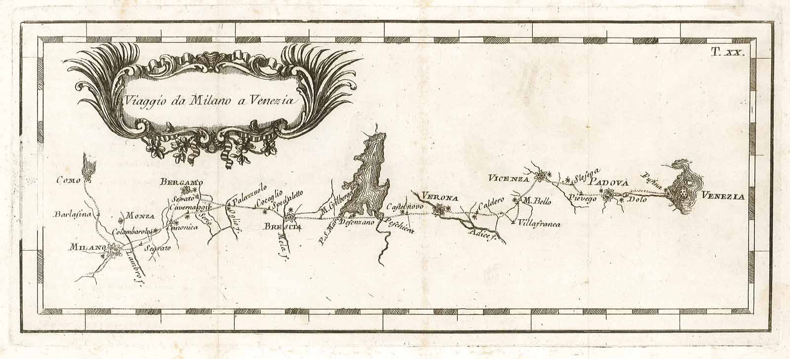 Itinerario, in prima edizione, del percorso stradale da Milano a Venezia, passando da: Monza, Bergamo, Brescia, Verona, Vicenza e Padova