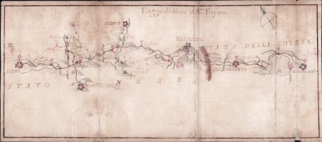 Rara carta itineraria manoscritta raffigurante i possibili viaggi della Toscana alla fine del XVIII secolo ove sono raffigurati i dettagliati percorsi con strade, Paesi, Chiese e Vicariati le Poste e i Castelli, finemente eseguita a china e colorata all'acquerello. Eseguita da Antonio Giachi, Firenze, circa 1760. A partire dalla seconda metà del ‘700 le guide postali vivono un periodo di grande diffusione grazie a John Ogilby con l’opera “Britannia” edita per la prima volta a Londra nel 1674, egli inventa il modello a “strisce”, la mappa inserita nel libretto infatti riporta la rappresentazione del singolo percorso da una città all’altra, con le tappe intermedie, e ricorda molto da vicino le carte della moderna metropolitana, una raffigurazione lineare ed essenziale ma di chiara e immediata lettura e comprensione. In Italia il modello a strisce risale ad una famiglia di cartografi - Giachi di Arezzo - che a partire dal 1740 circa, ebbero una bottega a Firenze “in via Lambertesca” e per due generazioni produssero moltissime carte itinerarie e libretti di viaggio esclusivamente manoscritti, pur in controtendenza rispetto alla moda dello stampato e alle esigenze del tempo, e ciò comportava una produzione decisamente minore, ma confezionata a misura del cliente. Di questa famiglia di cartografi - Luigi Giachi e i figli Antonio e Francesco - non si hanno molte notizie; si sa solo che furono funzionari tecnici, tra gli anni 50 e 90 del ‘700, al servizio dell’amministrazione Lorenese come agrimensori e disegnatori/copisti. Furono autori di un nutrito gruppo di atlanti e raccolte relativi alle oltre 40 province vicariali, o ai circondari comunali in cui era suddiviso il Granducato. Poco si può dire sulla produzione individuale di ciascuno di loro, se non per la firma che talvolta compare in alcune opere. Di Francesco le attribuzioni sono molto poche mentre di Luigi sappiamo che era stabilmente al servizio del granduca Pietro Leopoldo e Ferdinando III. Di Antonio invece sappiamo che fu autore di atlanti contenenti la serie di carte relative alle circoscrizioni giudiziarie della Toscana negli anni prima del 1772. La collezione Giachi, conservata e digitalizzata dalla Biblioteca Nazionale di Firenze, comprende 132 carte manoscritte realizzate nel 1780 rappresentanti diversi siti della Toscana. Le carte attengono a differenti tipologie cartografiche: carte di territori specifici come diocesi o vicariati, piante di città, piante di fortezze e castelli, vedute della costa o di paesaggi, carte rappresentanti i corsi dei fiumi (cfr. Moreni, Bibliografia storico-ragionata della Toscana, I, 425.) Cfr.