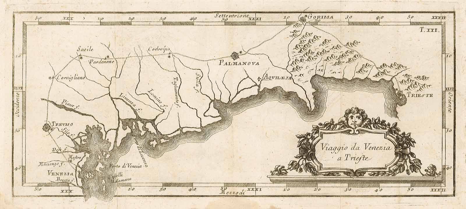 Itinerario raffigurante il percorso stradale tra le due città. Di seguito, alcune delle tappe del viaggio: Treviso, Carnigliano, Sacile, Codroipo, Palmanona, Gorizia