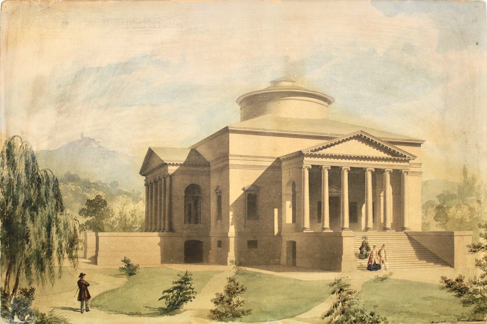 Acquerello originale policromo con disegno a lapis, datato e firmato, eseguito su carta Whatman applicata su cartone di supporto, mm 435x650. Piacevole acquerello di buona fattura e largo formato raffigurante la villa animata da alcune persone sui gradini ed in primo piano. Clemente Brusco fu pittore ed architetto veneziano del 19° secolo. Ottimo stato generale di conservazione con un difetto al margine sup. e lievi abrasioni agli spigoli.