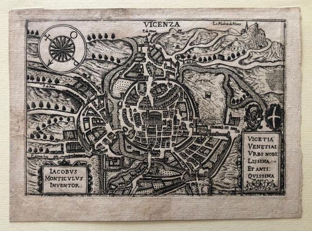 Francesco Bertelli, Padova, 1629. Pianta planimetrica della città tratta dal “Theatro delle Città d’Italia” di Pietro Bertelli, stampato dal figlio Francesco. Incisione in rame, b/n, cm 12,9 x 18,4 circa (alla lastra). Molto buono lo stato di conservazione.