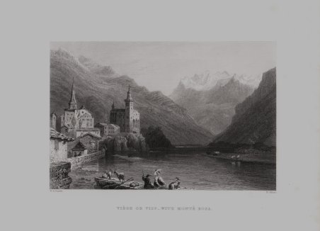 Veduta della cittadina svizzera di Visp (in fr. Viége), con il massiccio del Monte Rosa sullo sfondo. ' ' Acquaforte di Henry Adlard (1799 - 1893) ' ' da un disegno di William Henry Bartlett (1809 - 1854). ' L'illustrazione corredava l'opera ' ' Switzerland… illustrated in a series of views ' di William Beattie, edita a Londra da Virtue, nel 1836. ' In ottimo stato di conservazione. Stampa raffigurante una strada della città di Visp (Viège), in Svizzera. Veduta della cittadina, con il massiccio del Rosa sullo sfondo. ' Stampa in bianco e nero raffigurante un paesaggio montuoso con un fiume. In primo piano sono visibili un uomo, una donna con cappello e quattro capre su una grande roccia. Acquaforte, di Robert Brandard da un disegno di Samuel Prout, in ottimo stato di conservazione. Cfr.