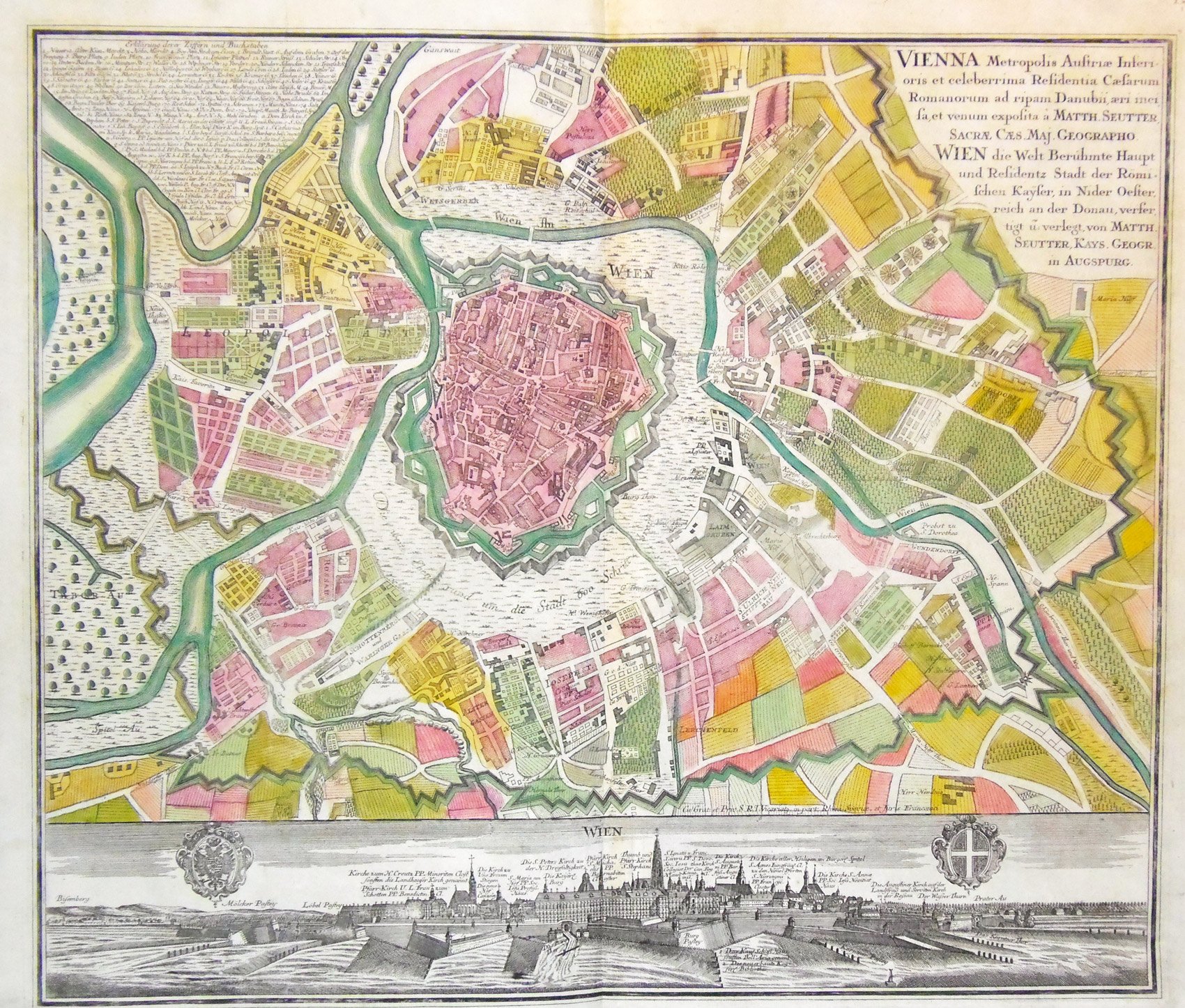 Incisione in rame, coloritura originale d'epoca con fascinosa veduta della città in basso e stemmi in bianco nero, mm 492x580. Seutter, dopo un apprendistato presso Homann a Norimberga, trasferitosi ad Augsburg verso il 1720, aprì la propria attività superando il maestro sotto il profilo della bellezza: le sue carte hanno sempre colori brillanti e cartigli elaborati. Esemplare in eccezionale stato di conservazione. <BR>Copperplate, original colour, mm 492x580. Very good example in fine colour. Seutter, after having worked with Homann in Nuremberg, opened his own activity in Augsburg around 1720. His maps always have elaborate cartouches and are very decorative and printed on good paper. <BR>