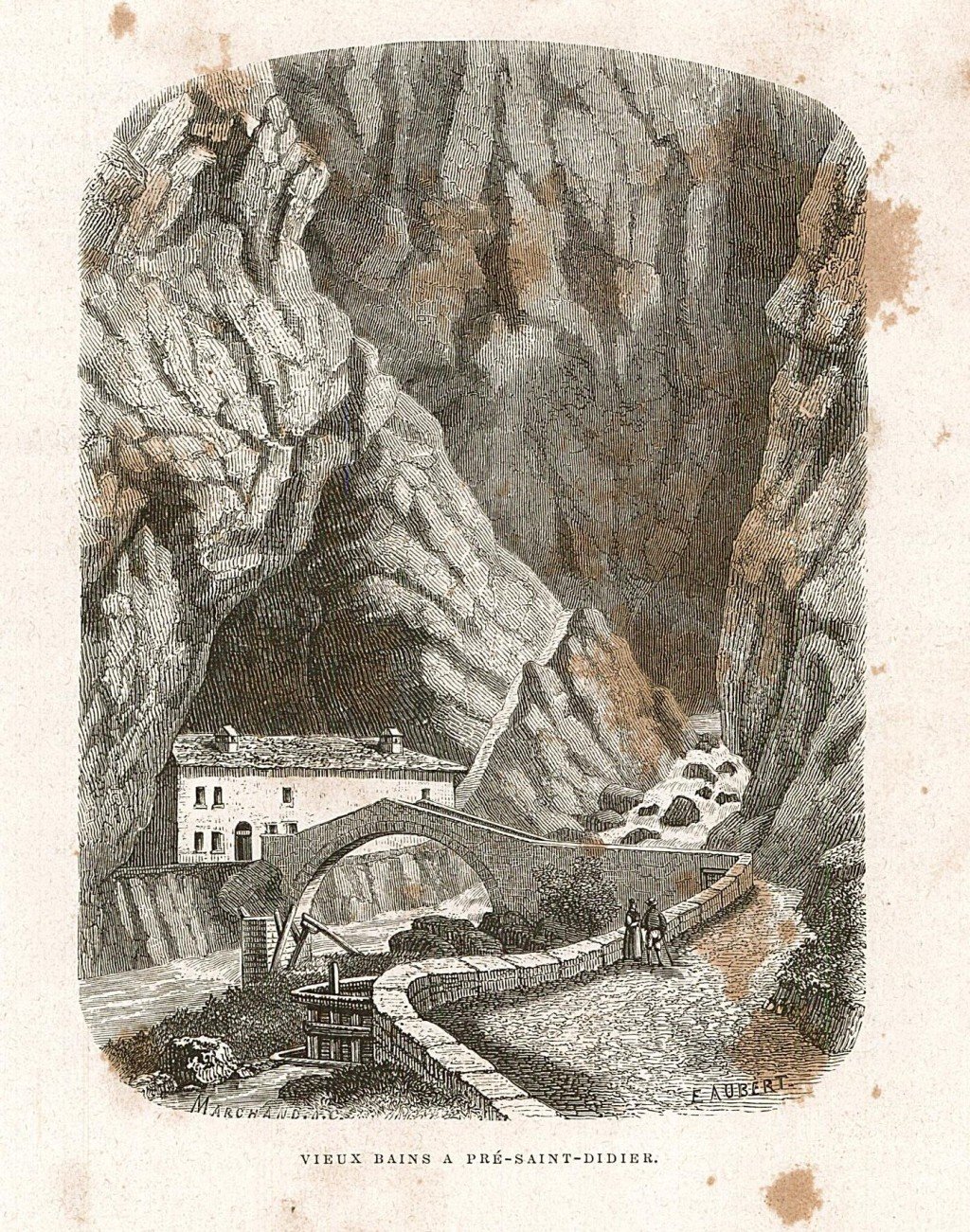 Veduta dei Bagni a Pré-Saint Didier in Val d'Aosta.Tratta dall'opera " La Vallée d'Aoste " stampata a Parigi da Amyot
