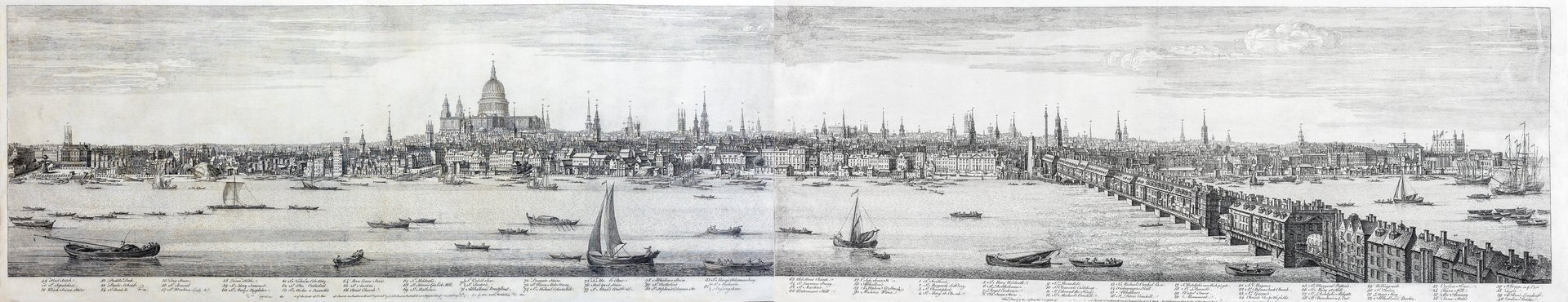 Incisioni in rame, mm 280x800 ciascuna. Due tavole del set di cinque tavole del "Panorama del Tamigi da Westminster Bidge a London Bridge", pubblicato nel 1749, considerato il più importante panorama di Londra dell'epoca. Professionali restauri, alcune integrazioni nel cielo ed ai margini, strappi restaurati, testo con piccole mancanze. Samuel Buck e suo fratello Nathaniel sono tra i migliori artisti topografici che abbiano lavorato in Inghilterra. A partire dal 1720, prima Samuel e poi i due fratelli girarono l'Inghilterra, disegnando vedute di città e paesi, castelli, antichità (in particolare monasteri in rovina) e altri punti di riferimento. Il coronamento della loro lunga carriera, la veduta singola più ambiziosa che avessero intrapreso, è questa importantissima prospettiva di Londra ripresa dal Tamigi, disegnata da cinque punti di osservazione e poi fusa in un unico panorama continuo, che si estende dal Westminster Bridge a valle fino al London Bridge e alla Torre di Londra. Mentre molti altri artisti - tra cui Venceslao Hollar, Jan Kip e William Morgan - avevano pubblicato panorami precedenti da punti di vista simili, queste prime versioni incorporavano una grande quantità di licenza artistica per adulare Londra. L'immagine di Bucks è una rappresentazione fedele e le sue dimensioni, i suoi dettagli e la sua accurata raffigurazione di Londra ne fanno una testimonianza definitiva della metà del XVIII secolo, in un'epoca di rapidi cambiamenti. Questo cambiamento è esemplificato al meglio dai due ponti raffigurati: il Westminster Bridge, in costruzione al momento del disegno, è una delle chiavi del futuro sviluppo di Londra, mentre il London Bridge conserva il suo aspetto medievale, con case, negozi e persino un mulino ad acqua. L'importanza storica del panorama di Buck, la sua attenzione ai minimi dettagli nella ricerca dell'accuratezza e la sua bellezza artistica lo rendono uno dei panorami più importanti e da collezione. Adams, London Illustrated, pp. 128-131; Hyde, A Prospect of Britain, tavole 40-44. This change is best exemplified by the two bridges depicted: Westminster Bridge, under construction at the time of the drawing, is one of the keys to London's future development, while London Bridge retains its medieval appearance, with houses, shops and even a mill with water. The historical importance of Buck's panorama, his attention to the smallest details in the pursuit of accuracy, and its artistic beauty make it one of the most important and collectible panoramas. Adams, London Illustrated, pp. 128-131; Hyde, A Prospect of Britain, plates 40-44<BR>Copper engravings, 280x800 mm each. Two plates from the set of five plates of the "Panorama of the Thames from Westminster Bidge to London Bridge", published in 1749, considered the most important panorama of London of the time. Professional restorations, some additions to the top and edges, restored tears, text with small defects. Samuel Buck and his brother Nathaniel are among the finest topographical artists to have worked in England. Starting in 1720, first Samuel and then the two brothers toured England, drawing views of cities and towns, castles, antiquities (particularly ruined monasteries), and other landmarks. The crowning achievement of their long career, the most ambitious single view they had undertaken, was this all-important perspective of London taken from the Thames, drawn from five vantage points and then merged into a single continuous panorama, extending from Westminster Bridge downstream to at London Bridge and the Tower of London. While many other artists - including Wenceslas Hollar, Jan Kip, and William Morgan - had published earlier panoramas from similar viewpoints, these early versions incorporated a great deal of artistic license to flatter London. Bucks' image is a faithful representation and its size, detail and accurate depiction of London make it a definitive testimony to the mid-18th century, in a time of rapid change. <BR>