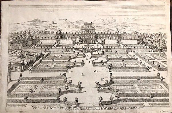 Incisione originale su rame (cm. 39,5x26 più buoni margini bianchi) edita dalla tipografia di Giovanni Giacomo de Rossi. Carta vergellata. Minuscolo forellino di tarlo nella parte incisa, altrimenti esemplare in eccellente stato di conservazione. Rara e ricercata veduta di Pamphili. In Arrigoni-Bertarelli (n. 3711) una citata ristampa della R. Calcografia.