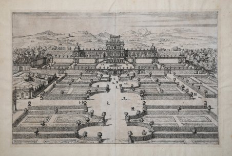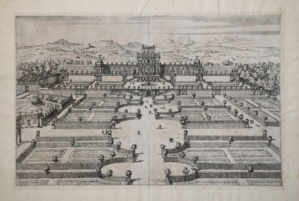 Bellissima veduta della Villa Phamphili stampata dalla tipografia di Giovanni Giacomo de Rossi alla metà del XVII secolo.Sebbene priva di firma, l'opera è attribuita, per motivi stilistici, all'artista francese Dominique Barriere, collaboratore della tipografia De Rossi. Quello che all'epoca era solo un modesto appezzamento agricolo fuori dalle mura gianicolensi, la cosiddetta Villa Vecchia, venne acquistata dal nobile Panfilo Pamphili il 23 ottobre 1630. Tra il 1644 e il 1652, mentre la famiglia Pamphili otteneva prestigio grazie al pontificato di Innocenzo X, fu affidata la progettazione della Villa Nuova allo scultore Alessandro Algardi e al pittore Giovanni Francesco Grimaldi, con la collaborazione del botanico Tobia Aldini per quanto riguardava i giardini Magnifica prova, impressa su carta vergata coeva e applicata su antico supporto di collezione, in ottimo stato di conservazione. Esemplare privo del titolo in basso. Rara. Beautiful view of Villa Phamphili printed by the typography of Giovanni Giacomo de Rossi, around 1650 Although unsigned, the plate is attributed, for stylistic reasons, to the French artist Dominique Barriere. The Villa Pamphili was the last and most magnificent of the Roman villas built in the 16th- and 17th- centuries: the construction of the villa, under the architect G.F. Grimaldi and the sculptor Algardi,lasted from 1644 to 1648, and the gardens were laid out in 1650. The house included some of the finest stucco work of the 17th century, and a main feature of the gardens was the collection of Roman and Greek statuary, displayed in niches in the facade of the villa and in the grounds. Magnificent proof, printed on coeval laid paper and applied to antique collection mount, in excellent condition. Example without the title and excudit at the bottom. ' Rare. Cfr.