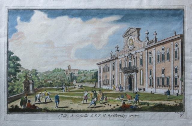 Dall’album “Vedute delle Ville e d’altri luoghi della Toscana”, 1750 circa. Incisione in rame all'acquaforte, recente ma ottima coloritura, cm 30,3 x 48,8 (alla lastra) più margini bianchi; in bs. a sn. “G. Z. delin”, in bs. a ds. “ N. Mogalli scolp.”. La facciata della villa in primo piano, i dintorni, figure al gioco e a conversazione nel piazzale antistante. Leggermente rifilati i laterali ma in margini e in buono stato di conservazione. .