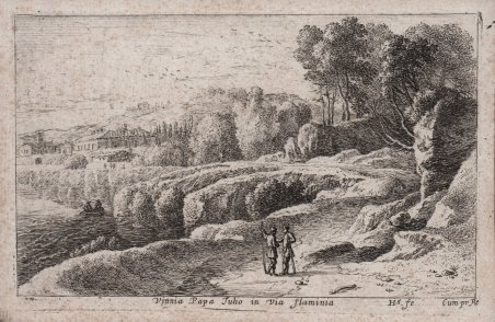 Due figure in conversazione sulla Via Flaminia a Roma, due uomini su una barchetta sul Tevere a sinistra, edifici sullo sfondo a sinistra (Villa di Giulio III) ai piedi della collina di Monte Mario. Acquaforte, 1652/53 circa, con iscrizione nel margine inferiore "Vinnia Papa Julio in Via flaminia" e firmata "HVS fe. et ex. Cum pr. Re” in basso a destra. Dalla serie Diverses veuës dedans et dehors de Rome, composta da dodici tavole con vedute di Roma e dintorni (Hollstein 50-62). I disegni della serie completa sono a Firenze. Herman van Swanevelt, detto Herman d'Italie (Woerden, 1603 – Parigi, 1655), è stato un pittore, disegnatore e incisore olandese. Produsse anche un gran numero di incisioni di alta qualità, che (come nel caso di Rembrandt), accrebbero la sua fama sia tra i contemporanei che tra i posteri. Secondo alcuni studiosi, le sue incisioni sono addirittura molto superiori ai dipinti, a causa del prevalere in questi di una fredda tonalità verde nei primi e medi piani e per essere gli ultimi troppo pesanti, scuri e cupi. Aveva un modo particolare di incidere: si esprimeva con tratti orizzontali un po' curvi. Evidenziava poco i contorni, se non per distinguere le masse. Utilizzava la punta secca e maggiormente il bulino, per dare armonia. Lasciò inoltre parecchi disegni, spesso studi preparatori per i suoi dipinti, anch'essi di ottima fattura. Bella impressione, stampata su carta vergata coeva, con margini, qualche ossidazione, altrimenti in buono stato di conservazione. Bibliografia Hollstein, Dutch and Flemish etchings, engravings and woodcuts c.1450-1700 (58.I); Bartsch, Le Peintre graveur (II.279.61). ' Two figures in conversation on the Via Flaminia in Rome, two men on a small boat on the Tiber at left, buildings in left background (Villa Giulia) at the foot of Monte Mario’s hill. Etching, circa1652/53, lettered in lower margin "Vinnia Papa Julio in Via flaminia" and signed "HVS fe. et ex. Cum pr. Re". From the Diverses veuës dedans et dehors de Rome series of twelve plates showing views in and near Rome (Hollstein 50-62). Drawings for the complete series are in Florence. Herman van Swanevelt, known as Herman d'Italie (Woerden, 1603 - Paris, 1655), was a Dutch painter, draughtsman and engraver. He also produced a large number of high-quality engravings, which (as in the case of Rembrandt), increased his fame among both his contemporaries and posterity. According to some scholars, his etchings are even far superior to the paintings, due to the prevalence in these of a cold green hue in the foreground and middle ground and for being the latter too heavy, dark, and gloomy. He had a peculiar way of engraving: he expressed himself with somewhat curved horizontal strokes. He emphasized contours little, except to distinguish masses. He used the dry point and more the burin, to give harmony. He also left several drawings, often preparatory studies for his paintings, which were also of excellent workmanship. A fine impression, printed on contemporary laid paper, with margins, some foxing, otherwise good condition. Bibliografia Hollstein, Dutch and Flemish etchings, engravings and woodcuts c.1450-1700 (58.I); Bartsch, Le Peintre graveur (II.279.61). Cfr.