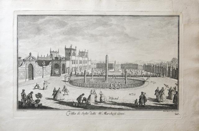 Dall’album “Vedute delle Ville e d’altri luoghi della Toscana”, 1750 circa. Incisione in rame all’acquaforte, cm 31,5 x 49,2 ca. (alla lastra), in bs. a sn.” G. Zocchi delineò”; in bs. a ds. “Pietro Monaco Scolpì Venezia” (sotto, il numero di rif. della tav., il 20). Bella veduta animata con un punto di vista leggermente decentrato sulla sinistra: la villa a sinistra e, a occupare il primo piano, il piazzale del grande giardino che si estende fino in lontananza; diverse dame, cavalieri, alcuni giardinieri e operai alla pulitura dei tombini. Un restauro all’angolo destro superiore del margine bianco, non tocca la parte incisa. Bell’esemplare in ampi margini.