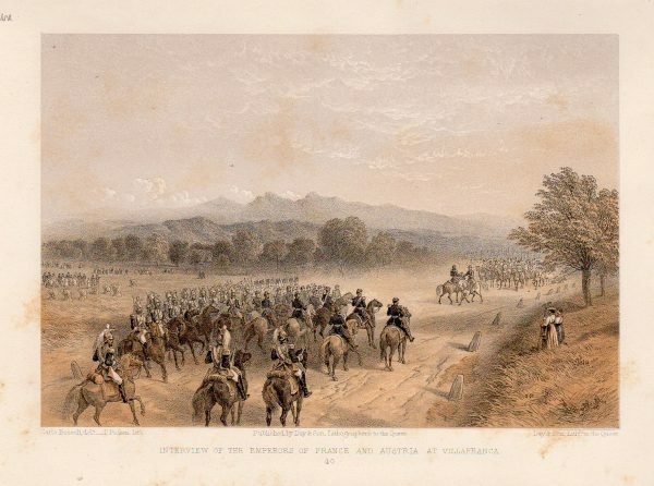 VILLAFRANCA PIEMONTE - Guerra d'Italia. Interview of the Emperor of France and Austria at Villafranca. Bella litografia raffigurante paesaggio campestre con numerose truppe a cavallo.