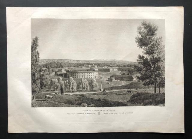 Incisione in rame all’acquaforte, b/n, cm 39 x 54 (al foglio). Un leggero aloncino al margine laterale destro, peraltro veduta finemente incisa e in buono stato di conservazione. Tratta dal “Voyage Pittoresque et Historique de l’Espagne” (Paris, Imprimerie P. Didot L’Ainé, avec les caracteres de Bodoni, 1806 o 1820), opera stampata in folio che consiste in una raccolta di bellissime incisioni in b/n finemente incise, per lo più relative all'Andalusia e alle regioni spagnole dell'Estremadura. Una è la veduta generale di Gibilterra, una di Cadice e una di Malaga; ci sono le vedute generali delle altre principali città, Madrid, Sevilla, Cordova, Toledo, Granada e Alhambra, accompagnate da altre vedute delle stesse città, con figurazioni di interni e di esterni di edifici, monumenti, ornamenti architettonici; alcune sono tavole di arti decorative. .