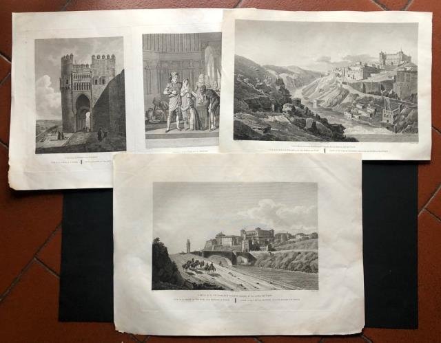 Suite di 03 incisioni in rame all’acquaforte, b/n, cm 39,5 x 54,5 (al foglio). Sporco l'angolo del margine superiore destro la “Interior del Alcazar de Sevilla", peraltro vedute finemente incise e in buono stato di conservazione. Tratta dal “Voyage Pittoresque et Historique de l’Espagne” (Paris, Imprimerie P. Didot L’Ainé, avec les caracteres de Bodoni, 1806 o 1820), opera stampata in folio che consiste in una raccolta di bellissime incisioni in b/n finemente incise, per lo più relative all'Andalusia e alle regioni spagnole dell'Estremadura. Una è la veduta generale di Gibilterra, una di Cadice e una di Malaga; ci sono le vedute generali delle altre principali città, Madrid, Sevilla, Cordova, Toledo, Granada e Alhambra, accompagnate da altre vedute delle stesse città, con figurazioni di interni e di esterni di edifici, monumenti, ornamenti architettonici; alcune sono tavole di arti decorative.