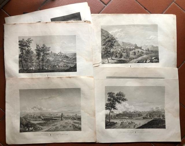 Suite di 11 incisioni in rame all’acquaforte, b/n, cm 39,5 x 54,5 (al foglio). Leggeri aloni al margine destro di alcune tavole e altri contenuti aloni marginali, sporca e in condizioni mediocri la “Vista del Escurial tomada del camino real de Madrid”, peraltro vedute finemente incise e in buono stato di conservazione. Tratta dal “Voyage Pittoresque et Historique de l’Espagne” (Paris, Imprimerie P. Didot L’Ainé, avec les caracteres de Bodoni, 1806 o 1820), opera stampata in folio che consiste in una raccolta di bellissime incisioni in b/n finemente incise, per lo più relative all'Andalusia e alle regioni spagnole dell'Estremadura. Una è la veduta generale di Gibilterra, una di Cadice e una di Malaga; ci sono le vedute generali delle altre principali città, Madrid, Sevilla, Cordova, Toledo, Granada e Alhambra, accompagnate da altre vedute delle stesse città, con figurazioni di interni e di esterni di edifici, monumenti, ornamenti architettonici; alcune sono tavole di arti decorative.