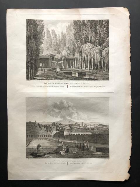 Due incisioni in rame all’acquaforte stampate su unico foglio, b/n, cm 38 x 54 (al foglio). Un paio di leggeri aloncini ai margini, peraltro vedute finemente incise e in buono stato di conservazione. Tratta dal “Voyage Pittoresque et Historique de l’Espagne” (Paris, Imprimerie P. Didot L’Ainé, avec les caracteres de Bodoni, 1806 o 1820), opera stampata in folio che consiste in una raccolta di bellissime incisioni in b/n finemente incise, per lo più relative all'Andalusia e alle regioni spagnole dell'Estremadura. Una è la veduta generale di Gibilterra, una di Cadice e una di Malaga; ci sono le vedute generali delle altre principali città, Madrid, Sevilla, Cordova, Toledo, Granada e Alhambra, accompagnate da altre vedute delle stesse città, con figurazioni di interni e di esterni di edifici, monumenti, ornamenti architettonici; alcune sono tavole di arti decorative. .