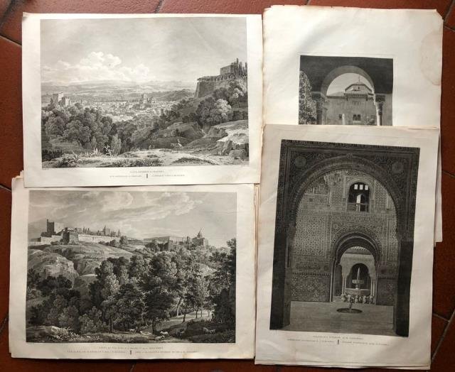 Suite di 22 incisioni in rame all’acquaforte, b/n, cm 39,5 x 54,5 (al foglio). Alcuni aloni marginali su alcune tavole, peraltro vedute finemente incise e in buono stato di conservazione. Tratta dal “Voyage Pittoresque et Historique de l’Espagne” (Paris, Imprimerie P. Didot L’Ainé, avec les caracteres de Bodoni, 1806 o 1820), opera stampata in folio che consiste in una raccolta di bellissime incisioni in b/n finemente incise, per lo più relative all'Andalusia e alle regioni spagnole dell'Estremadura. Una è la veduta generale di Gibilterra, una di Cadice e una di Malaga; ci sono le vedute generali delle altre principali città, Madrid, Sevilla, Cordova, Toledo, Granada e Alhambra, accompagnate da altre vedute delle stesse città, con figurazioni di interni e di esterni di edifici, monumenti, ornamenti architettonici; alcune sono tavole di arti decorative.