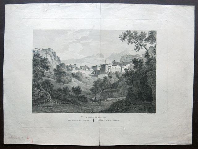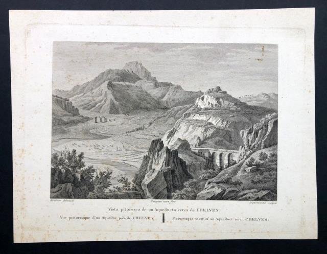 Incisione in rame, 1830 circa, b/n, cm 24,5 x 32 (al foglio). Veduta dell'area montuosa con un acquedotto nei pressi di Chelves, Valencia, Spagna. Asimmetrica la battuta della lastra, margini del foglio un poco rifilati, minuto foxing, discreto stato.