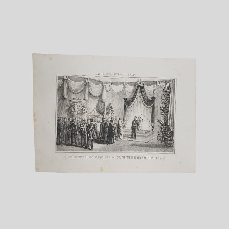 Litografia originale su carta, tratta da Domenico Valente, Storia della guerra di Sicilia, Napoli, 1862. Tavola sciolta, cm 35×25. Naturali tracce d’uso, qualche fioritura, in buone condizioni. Litografia originale raffigurante l’arrivo del Re Vittorio Emanuele II a Firenze. Si tratta di una stampa originale dell’epoca, non di una riproduzione moderna, destinata in origine alla consultazione e alla divulgazione storica, oggi apprezzata come documento collezionistico e iconografico. Esemplare di sicuro interesse per collezionisti di Risorgimento italiano, storia militare, iconografia ottocentesca e per studiosi del processo di unificazione nazionale.