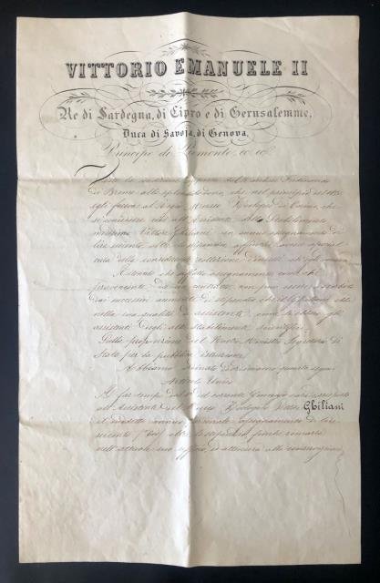 Decreto promulagato da Vittorio Emanuele II. Composto in quaderno (due fogli e quattro pagine, di cui due compilate e due libere in bianco), redatto a inchiostro marrone sulle prime due pagine, datato 31 gennaio 1860 e firmato per esteso " Vittorio Emanuele". Circa una pregevole donazione fatta dal Marchese Ferdinando di Breme (Fernando Arborio Gattinara di Breme, al titolo Arborio Gattinara di Sartirana, entomologo e politico italiano, Milano, 1807 - Firenze, 1869) al Museo Zoologico di Torino affinché si concedesse all'assistente dello Stabilimento Medesimo, Certo Vittore Ghiliani, un assegnamento di Lire Seicento, oltre lo stipendio, affinché avesse specie cura della considerevole collezione di insetti che il Marchese aveva donato. Il presente Decreto sarà registrato alla Corte dei Conti il 23 Gennaio 1860. Conservato apposto il proprio sigillo bianco. Buono lo stato di conservazione. Vittorio Emanuele II fu colui che inviò l'esercito piemontese a combattere la guerra di Crimea dal 1854 al 1857 e che scatenò l'offensiva austriaca nel 1859, dando il via alla seconda guerra d'indipendenza e, grazie all'alleanza con la Francia, ottenne la vittoria e l'annessione della Lombardia. Divenne re d'Italia nel 1861. Vittore Ghiliani è ricordato in ambito della zoologia ottocentesca italiana per aver portato avanti la ricerca e la sistemazione di importanti collezioni entomologiche e per il suo ruolo di organizzatore, preparatore e conservatore del Museo Zoologico di Torino, uno dei musei naturalistici più importanti d'Italia. Tra queste collezioni si ricordano quella dei Dermatteri di F. A. Bonelli e quella, appunto, dei Coleotteri di Ferdinando Arborio di Gattinara Marchese di Breme, arricchita a suo tempo di una parte della classica raccolta del conte P. F. de Dejéan, dei Coleotteri di F. Baudi di Selve e dei Lepidotteri di L. Bellardi; circa duecentomila esemplari da conservare. Al Ghiliani facevano riferimento gli entomologi di tutto il mondo.