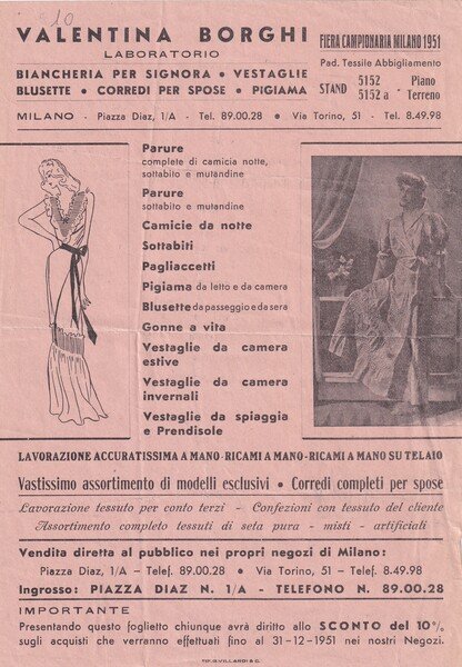 Volantino pubblicitario Laboratorio VALENTINA BORGHI - Fiera Campionaria Miano 1951 Pad. tessile Abbigliamento