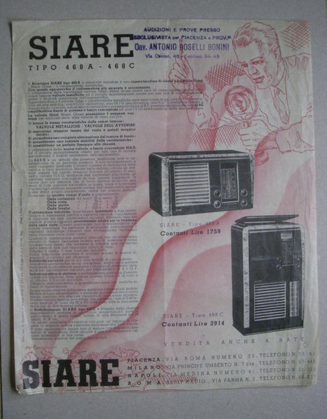 Volantino velina SIARE Valvole OCTAL / Radiofonografo 1937.