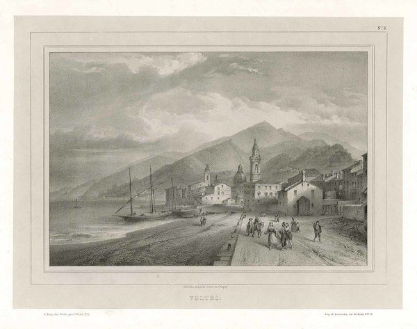 'La suggestiva inquadratura proposta dallo Cahpuy., riprende dalla spiaggia di levante,.il nucleo orientale e quello centrale di una struttura urbana tripartita: nell'ordine, il borgo di Gattegà e il borgo di Leira, mentre la parte più occidentale dell'abitato ( il borgo di Cerusa, dominato dall'omonimo castello) si lascia intravedere a stento, liberando sul fondo brumoso profili di case che scendono quasi alla riva del mare.'. (*)La litografia si presenta stampata su carta cina, foglio con ampi margini che gode di un ottimo stato di conservazione.Rif:Astengo, Fiaschini 'La Route de Genes', p. 200 *