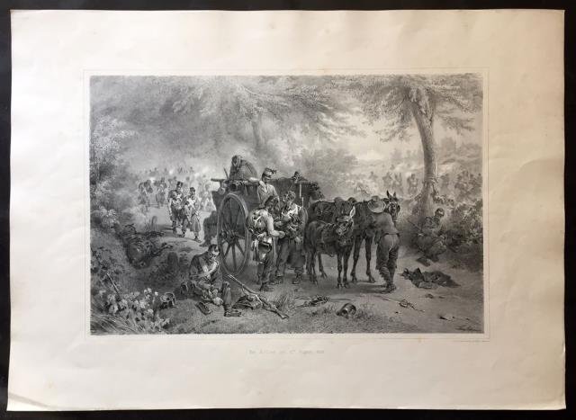 Da “Erinnerungen an die Feldzuge. der K. K. Oester. Armee in italien in den Janren 1848 – 1849” (Adam in Munchen, 1851). Litografia, b/n, cm 44 x 61 (il foglio). Animata scena di un momento di tregua dalla battaglia durante la fase finale dei moti della prima guerra d’Indipendenza, prima dell'armistizio. Alcune leggere fioriture ai margini ma buona impressione e buono stato. Alcune leggere fioriture ai margini ma buona impressione e buono stato. .