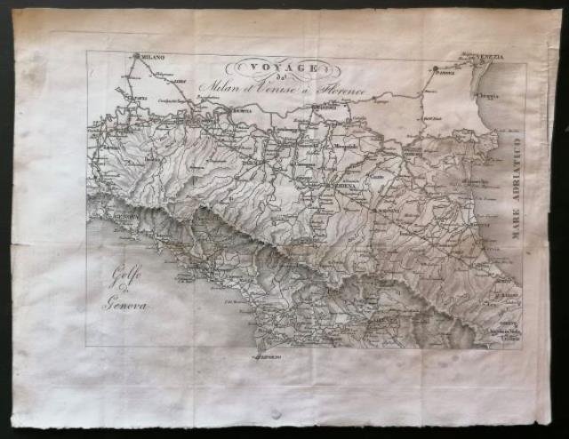 Sonzogno - Artaria, Milano, 1830. Incisione in rame all'acquaforte, b/n, cm 28,5 x 37 circa (il foglio) più margini. Tratta dalla “Nouveau guide du Voyageur en Italie. Orné de cartes itinéraires et du plan des villes principales”, la fortunata guida impressa da Francesco Sonzogno, edita dai Fratelli Artaria e più volte ristampata nel corso della prima metà dell'800. Lievi fioriture ai margini, consuete pieghe editoriali, buono stato di conservazione.