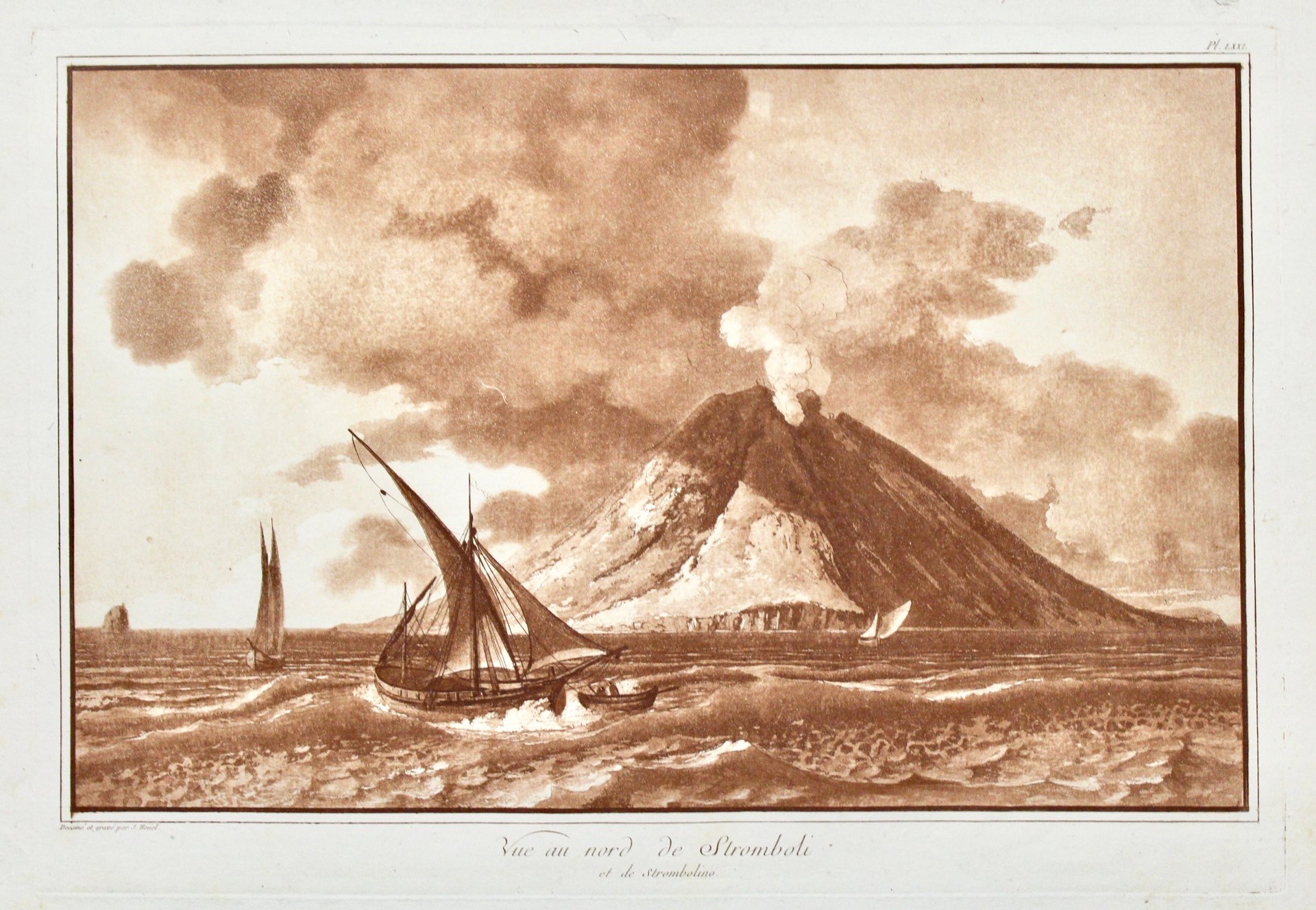 Incisione in rame, mm 230x360, stampata in seppia. Tratta da "Voyage pittoresque des isles de Sicile, de Malte et de Lipari". Ottimo esemplare. Margine superiore con foglio irregolare ed una lieve escoriazione, comunque fuori dall'inciso. Qualche leggera fioritura nei margini. <BR>