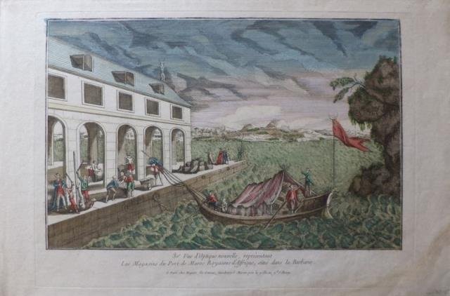 Vue d'Optique nouvelle, représentant Les Magasins du Port de Maroc Royaume d'Affrique, situé dans la Barbarie.