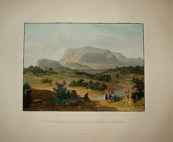 Acquatinta originale (cm. 29,5x21,5) tratta dal ‘Voyage pittoresque en Sicile’ di Achille Etienne Gigault de la Salle. Splendida coloritura coeva eseguita a spese dell’editore Firmin Didot. Ottimo esemplare ad ampi margini. Rara tiratura.