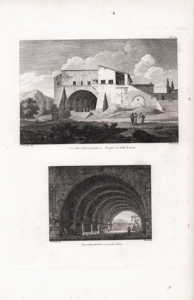 Coppia di vedute tratta dal ' Recueil de Vues et fabriques pittoresques d'Italie, Dessinées d'apres Nature, Et publiées par C. Bourgeois, Peintre. Questo album di incisioni tratte da disegni di Florent Constant Bourgeois, incisi da Guyot e Lameau, comprende per la maggior parte vedute di Roma e dei suoi dintorni (Tivoli, Marino, Subiaco, Montecassino, Anagni, Grottaferrata, Frascati, Genzano, Castel Gandolfo, ecc.), ma anche di Firenze, Pisa, Siena, Genova, Caserta e Napoli. L’opera, il cui frontespizio non fu mai stampato, uscì a dispense come raccolta di stampe e fu edita dallo stesso Bourgeois a Parigi, con indirizzo ' Mousé des Artistes, rue de Sorbonne. Incisione in rame, impressa su carta vergata coeva, piccole ossidazioni, per il resto in buone condizioni. Florent-Constant Bourgeois, detto “Bourgeois du Castelet” era originariamente un ufficiale militare. Bourgeois si dedicò esclusivamente all'arte a partire dalla metà degli anni '90, perfezionando la sua formazione nello studio di Jacques-Louis David, dove si specializzò in paesaggi e divenne soprattutto uno straordinario disegnatore; Paul Marmottan, nella sua "Ecole française de peinture, 1789-1830", fa riferimento alla sua " ' grande pureté de style et l’exécution brillante de ses dessins, la plupart très remarquables, notamment ceux au lavis". Molto ricercato e apprezzato durante la sua vita, Bourgeois ha ricevuto numerosi premi e riconoscimenti artistici, una casa al Louvre e la Legion d'onore nel 1827. Viveva al numero 3 di quai Malaquais a Parigi. La sua attività di pittore è oggi meno conosciuta, eppure espose quadri in quasi tutti i Salon dal 1791 al 1830, con solo vedute dell'Italia per il periodo dalla Rivoluzione al Consolato. Bibliografia Brunet I, 1178; Cohen I, 183; Graesse, I 512. Couple of views taken from the ' Recueil de Vues et fabriques pittoresques d'Italie, Dessinées d'apres Nature, Et publiées par C. Bourgeois, Peintre. This album of engravings taken from drawings by Florent Constant Bourgeois, engraved by Guyot and Lameau, includes mostly views of Rome and its environs (Tivoli, Marino, Subiaco, Montecassino, Anagni, Grottaferrata, Frascati, Genzano, Castel Gandolfo, etc.), but also of Florence, Pisa, Siena, Genoa, Caserta and Naples. The work, whose frontispiece was never printed, came out in handouts as a collection of prints and was edited by Bourgeois himself in Paris, with address ' Mousé des Artistes, rue de Sorbonne. Florent-Constant Bourgeois, known as "Bourgeois du Castelet," was originally a military officer. Bourgeois devoted himself exclusively to art from the mid-1790s, perfecting his training in Jacques-Louis David's studio, where he specialized in landscapes and became above all an extraordinary draughtsman; Paul Marmottan, in his "Ecole française de peinture, 1789-1830," refers to his " grande pureté de style et l'exécution brillante de ses dessins, la plupart très remarquables, notamment ceux au lavis." Highly sought after and appreciated during his lifetime, Bourgeois received numerous artistic prizes and awards, a house in the Louvre, and the Legion of Honor in 1827. He lived at No. 3 quai Malaquais in Paris. His activity as a painter is less well known today, yet he exhibited paintings in almost every Salon from 1791 to 1830, with only views of Italy for the period from the Revolution to the Consulate. Copperplate engraving, impressed on contemporary laid paper, minor oxidation, otherwise in good condition. Bibliografia Brunet I 1178. Cfr.