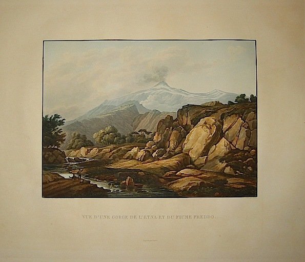 Acquatinta originale (cm. 29,5x21,5) tratta dal ‘Voyage pittoresque en Sicile’ di Achille Etienne Gigault de la Salle. Splendida coloritura coeva eseguita a spese dell’editore Firmin Didot. Ottimo esemplare ad ampi margini. Rara tiratura.