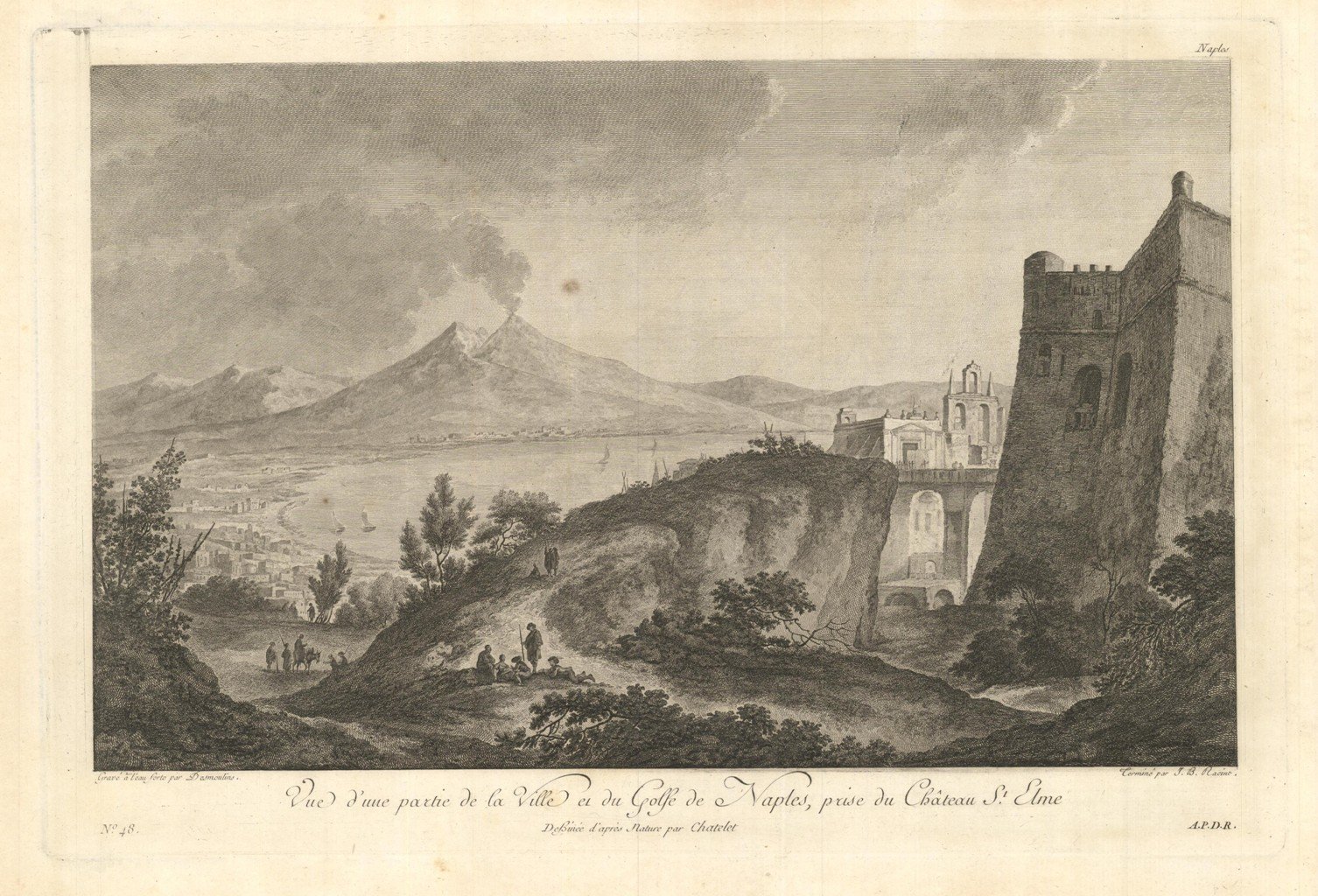 Veduta panoramica della città, presa dal Castello di Sant'Elmo verso il Vesuvio. Tratta dalla prima edizione della monumentale opera edita da Jean-Claude Richard de Saint-Non, meglio noto come Abate di Saint-Non " Voyage ou Description des Royaumes de Naples et de Sicilie ". Pubblicata a Parigi dal 1781 al 1786.