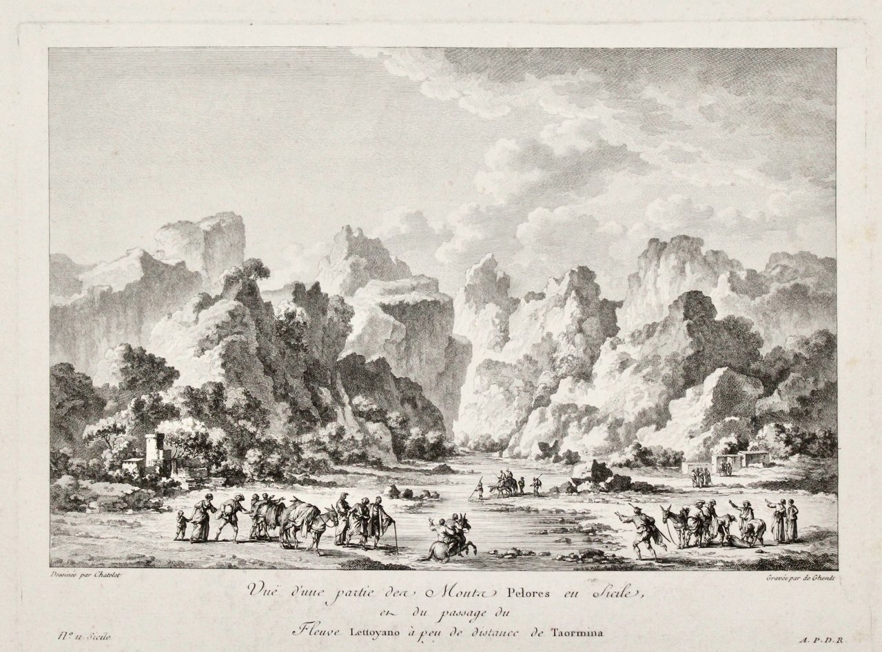 Vue d‘une partie des Monts Pelores en Sicile et du passage du Fleuve Lettoyano à peu de distance de Taormina.