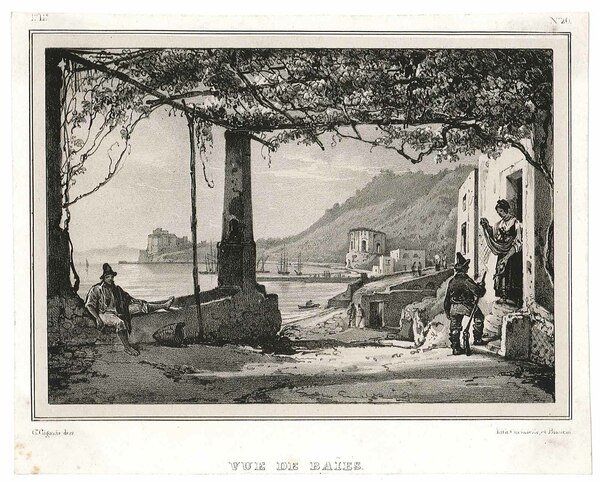 Graziosa ed animata animata veduta della località di Baia nei Campi Flegrei, litografata da Cuciniello e Bianchi da disegno di Giacinto Gigante. Pregiata edizione stampata su carta cina. Margini ridotti