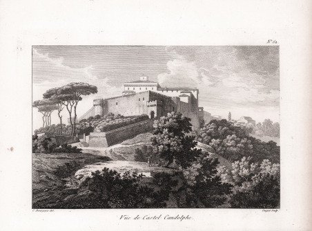 Veduta tratta dal ' Recueil de Vues et fabriques pittoresques d'Italie, Dessinées d'apres Nature, Et publiées par C. Bourgeois, Peintre. Questo album di incisioni tratte da disegni di Florent Constant Bourgeois, incisi da Guyot e Lameau, comprende per la maggior parte vedute di Roma e dei suoi dintorni (Tivoli, Marino, Subiaco, Montecassino, Anagni, Grottaferrata, Frascati, Genzano, Castel Gandolfo, ecc.), ma anche di Firenze, Pisa, Siena, Genova, Caserta e Napoli. L’opera, il cui frontespizio non fu mai stampato, uscì a dispense come raccolta di stampe e fu edita dallo stesso Bourgeois a Parigi, con indirizzo ' Mousé des Artistes, rue de Sorbonne. Incisione in rame, impressa su carta vergata coeva, piccole ossidazioni, per il resto in buone condizioni. Florent-Constant Bourgeois, detto “Bourgeois du Castelet” era originariamente un ufficiale militare. Bourgeois si dedicò esclusivamente all'arte a partire dalla metà degli anni '90, perfezionando la sua formazione nello studio di Jacques-Louis David, dove si specializzò in paesaggi e divenne soprattutto uno straordinario disegnatore; Paul Marmottan, nella sua "Ecole française de peinture, 1789-1830", fa riferimento alla sua " ' grande pureté de style et l’exécution brillante de ses dessins, la plupart très remarquables, notamment ceux au lavis". Molto ricercato e apprezzato durante la sua vita, Bourgeois ha ricevuto numerosi premi e riconoscimenti artistici, una casa al Louvre e la Legion d'onore nel 1827. Viveva al numero 3 di quai Malaquais a Parigi. La sua attività di pittore è oggi meno conosciuta, eppure espose quadri in quasi tutti i Salon dal 1791 al 1830, con solo vedute dell'Italia per il periodo dalla Rivoluzione al Consolato. Bibliografia Brunet I, 1178; Cohen I, 183; Graesse, I 512. View taken from the ' Recueil de Vues et fabriques pittoresques d'Italie, Dessinées d'apres Nature, Et publiées par C. Bourgeois, Peintre. This album of engravings taken from drawings by Florent Constant Bourgeois, engraved by Guyot and Lameau, includes mostly views of Rome and its environs (Tivoli, Marino, Subiaco, Montecassino, Anagni, Grottaferrata, Frascati, Genzano, Castel Gandolfo, etc.), but also of Florence, Pisa, Siena, Genoa, Caserta and Naples. The work, whose frontispiece was never printed, came out in handouts as a collection of prints and was edited by Bourgeois himself in Paris, with address ' Mousé des Artistes, rue de Sorbonne. Florent-Constant Bourgeois, known as "Bourgeois du Castelet," was originally a military officer. Bourgeois devoted himself exclusively to art from the mid-1790s, perfecting his training in Jacques-Louis David's studio, where he specialized in landscapes and became above all an extraordinary draughtsman; Paul Marmottan, in his "Ecole française de peinture, 1789-1830," refers to his " grande pureté de style et l'exécution brillante de ses dessins, la plupart très remarquables, notamment ceux au lavis." Highly sought after and appreciated during his lifetime, Bourgeois received numerous artistic prizes and awards, a house in the Louvre, and the Legion of Honor in 1827. He lived at No. 3 quai Malaquais in Paris. His activity as a painter is less well known today, yet he exhibited paintings in almost every Salon from 1791 to 1830, with only views of Italy for the period from the Revolution to the Consulate. Copperplate engraving, impressed on contemporary laid paper, minor oxidation, otherwise in good condition. Bibliografia Brunet I 1178. Cfr.