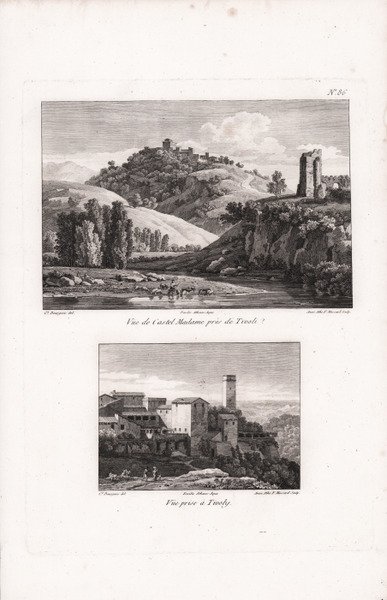 Coppia di vedute tratta dal ' Recueil de Vues et fabriques pittoresques d'Italie, Dessinées d'apres Nature, Et publiées par C. Bourgeois, Peintre. Questo album di incisioni tratte da disegni di Florent Constant Bourgeois, incisi da Guyot e Lameau, comprende per la maggior parte vedute di Roma e dei suoi dintorni (Tivoli, Marino, Subiaco, Montecassino, Anagni, Grottaferrata, Frascati, Genzano, Castel Gandolfo, ecc.), ma anche di Firenze, Pisa, Siena, Genova, Caserta e Napoli. L’opera, il cui frontespizio non fu mai stampato, uscì a dispense come raccolta di stampe e fu edita dallo stesso Bourgeois a Parigi, con indirizzo ' Mousé des Artistes, rue de Sorbonne. Incisione in rame, impressa su carta vergata coeva, piccole ossidazioni, per il resto in buone condizioni. Florent-Constant Bourgeois, detto “Bourgeois du Castelet” era originariamente un ufficiale militare. Bourgeois si dedicò esclusivamente all'arte a partire dalla metà degli anni '90, perfezionando la sua formazione nello studio di Jacques-Louis David, dove si specializzò in paesaggi e divenne soprattutto uno straordinario disegnatore; Paul Marmottan, nella sua "Ecole française de peinture, 1789-1830", fa riferimento alla sua " ' grande pureté de style et l’exécution brillante de ses dessins, la plupart très remarquables, notamment ceux au lavis". Molto ricercato e apprezzato durante la sua vita, Bourgeois ha ricevuto numerosi premi e riconoscimenti artistici, una casa al Louvre e la Legion d'onore nel 1827. Viveva al numero 3 di quai Malaquais a Parigi. La sua attività di pittore è oggi meno conosciuta, eppure espose quadri in quasi tutti i Salon dal 1791 al 1830, con solo vedute dell'Italia per il periodo dalla Rivoluzione al Consolato. Bibliografia Brunet I, 1178; Cohen I, 183; Graesse, I 512. Couple of views taken from the ' Recueil de Vues et fabriques pittoresques d'Italie, Dessinées d'apres Nature, Et publiées par C. Bourgeois, Peintre. This album of engravings taken from drawings by Florent Constant Bourgeois, engraved by Guyot and Lameau, includes mostly views of Rome and its environs (Tivoli, Marino, Subiaco, Montecassino, Anagni, Grottaferrata, Frascati, Genzano, Castel Gandolfo, etc.), but also of Florence, Pisa, Siena, Genoa, Caserta and Naples. The work, whose frontispiece was never printed, came out in handouts as a collection of prints and was edited by Bourgeois himself in Paris, with address ' Mousé des Artistes, rue de Sorbonne. Florent-Constant Bourgeois, known as "Bourgeois du Castelet," was originally a military officer. Bourgeois devoted himself exclusively to art from the mid-1790s, perfecting his training in Jacques-Louis David's studio, where he specialized in landscapes and became above all an extraordinary draughtsman; Paul Marmottan, in his "Ecole française de peinture, 1789-1830," refers to his " grande pureté de style et l'exécution brillante de ses dessins, la plupart très remarquables, notamment ceux au lavis." Highly sought after and appreciated during his lifetime, Bourgeois received numerous artistic prizes and awards, a house in the Louvre, and the Legion of Honor in 1827. He lived at No. 3 quai Malaquais in Paris. His activity as a painter is less well known today, yet he exhibited paintings in almost every Salon from 1791 to 1830, with only views of Italy for the period from the Revolution to the Consulate. Copperplate engraving, impressed on contemporary laid paper, minor oxidation, otherwise in good condition. Bibliografia Brunet I 1178. Cfr.