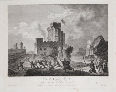 Veduta pubblicata nel ' Voyage Pittoresque ou description des Royaumes de Naples et de Sicile, opera in 5 volumi per la prima volta stampati a Parigi tra 1781 e il 1786. Richard de Saint-Non conobbe, durante il suo viaggio a Roma, i due già celebri pittori francesi Jean Honoré Fragonard e Hubert Robert, con i quali prosegue il suo viaggio per tutto il paese. Da questa grande amicizia nasce l’idea e la collaborazione per l’ambizioso progetto di documentare graficamente tutti i principali monumenti dell’Italia Meridionale e della Sicilia. Da qui, tra il 1781 ed il 1786, con l’aiuto di numerosi ed importanti architetti, pittori ed incisori, venne alla luce il Voyage Pittoresque ou description des Royaume de Naples et de Sicilie, opera composta di cinque volumi che uscirono annualmente. Incredibile sforzo tipografico, l’opera raccoglie quasi per intero gli appunti di viaggio del Saint-Non, adeguatamente assemblati e corretti; il corpus grafico è composto di ben 542 incisioni all’acquaforte e bulino, opera dei principali artisti di riproduzione del periodo. Da un punto di vista editoriale l’iniziativa riscuote immediatamente un grandissimo successo: il libro diviene un vero e proprio modello tipografico, sul quale sono basate diverse pubblicazioni dell’impero napoleonico. Dal punto di vista artistico le vedute, i paesaggi e le rovine conservano, e non può essere altrimenti, lo stile pittorico e romantico del Fragonard, del Robert, del Desprez, e di tutti gli altri artisti che collaborano nella realizzazione di questa monumentale opera. Il notevole successo commerciale della raccolta è testimoniato dalla ristampa, tra il 1795 ed il 1798, delle sole tavole pittoriche. Un’ulteriore edizione è stampata nel 1829 dal Dufour. Esemplare tratto dal ' Voyage Pittoresque, ' prima edizione con l’acronimo del privilegio reale. ' Acquaforte, stampata su carta vergata coeva, leggere ossidazioni, per il resto in ottimo stato di conservazione. View taken from the Voyage Pittoresque ou description des Royaume de Naples et de Sicilie by Richard de Saint-Non. During his trip to Rome, Richard de Saint-Non met two already famous French painters, Jean Honoré Fragonard and Hubert Robert, with whom he travelled along Italy. Their friendship led to the cooperation for the ambitious project of depicting all the main monuments of Southern Italy and Sicily. Between 1781 and 1786, with the assistance of many contemporary artists, he realized the Voyage Pittoresque ou description des Royaume de Naples et de Sicilie, a five volumes work published annually. As a result of a great typographical effort, the work is a collection of Sain-Non’s travelling notes; the graphic part is made up of 542 engravings and etchings, realized by the most important artists of the period. The work is immediately successful, for the book became a new typographical model for the following publications. From an artistic point of view, the views, landscapes and antiquity keep the Romantic pictorial style of Fragonard, Robert, Desprez and all the other artists that took part in this monumental project. The re-issue, between 1795 and 1798, of the pictorial plates, witnesses the great success of this project. A re-issue of the whole work was edited in 1829 by Dufour. Example taken from the first edition of the work, with the acronym of the Royal priviledge. ' Etching, printed on contemporary laid paper, light foxing, otherwise good condition. Cfr.
