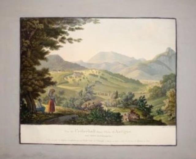 Basle, Suisse, 1840 circa. Incisione in rame all'acquantinta, colore d'epoca, cm 22,5 x 28 (alla lastra), margini in gouache grigio. Piacevole scena animata in vivace e fine coloritura, buona conservazione.