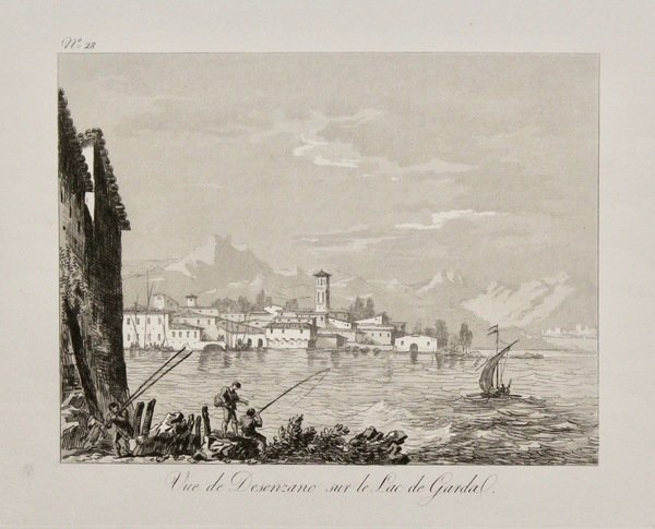 Fascinosa incisione in rame all'acquatinta monocroma grigia, mm 180x235; raffigura Desenzano sullo sfondo con una scena animata di pesca in primo piano. Eseguita da uno dei più stimati e innovatori artisti e incisori francesi vissuto tra sette e ottocento. Tratta da " Voyage pittoresque et historique du nord de l'Italie " di Bruun Neergaard. Ottimo esemplare marginosissimo in perfetto stato di conservazione. € 400<BR><BR><BR>