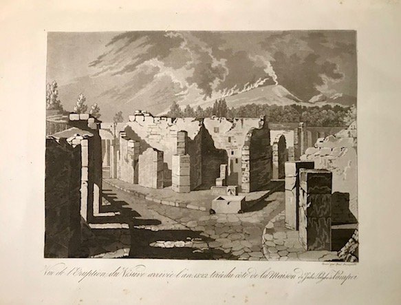 Acquatinta originale (cm. 32x26,5 più ampi margini bianchi) tratta dall’opera ‘Pompeia. Trattato pittorico, storico, e geometrico.’. Piccolo forellino al margine superiore bianco, altrimenti esemplare in ottimo stato di conservazione. Non comune.