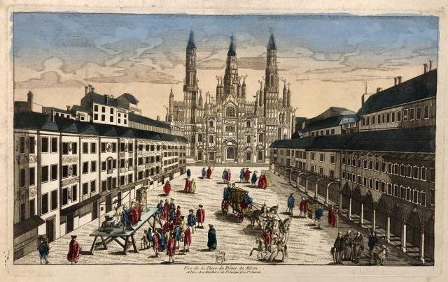 Paris, chez Mondhare, 1780 circa. Incisione in rame all'acquaforte, colore d'epoca, cm 25 x 40 (alla battuta) più margini. Veduta ottica animata della piazza del Duomo di Milano. Una piccola mancanza al margine inferiore, controfondata, in margini e in vivace coloritura, buon esemplare.