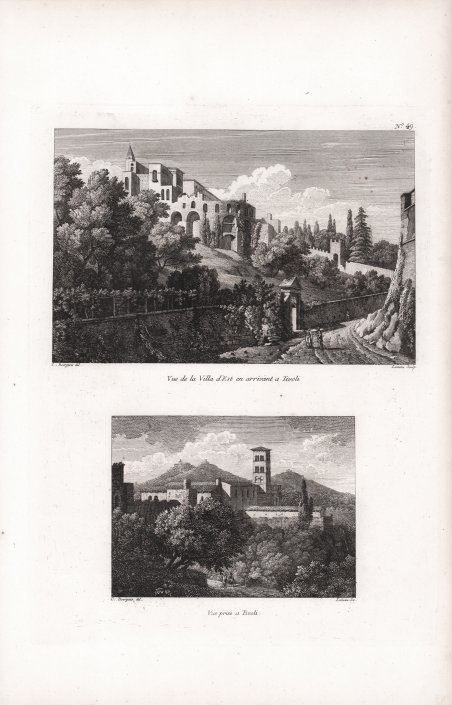 Coppia di vedute tratta dal ' Recueil de Vues et fabriques pittoresques d'Italie, Dessinées d'apres Nature, Et publiées par C. Bourgeois, Peintre. Questo album di incisioni tratte da disegni di Florent Constant Bourgeois, incisi da Guyot e Lameau, comprende per la maggior parte vedute di Roma e dei suoi dintorni (Tivoli, Marino, Subiaco, Montecassino, Anagni, Grottaferrata, Frascati, Genzano, Castel Gandolfo, ecc.), ma anche di Firenze, Pisa, Siena, Genova, Caserta e Napoli. L’opera, il cui frontespizio non fu mai stampato, uscì a dispense come raccolta di stampe e fu edita dallo stesso Bourgeois a Parigi, con indirizzo ' Mousé des Artistes, rue de Sorbonne. Incisione in rame, impressa su carta vergata coeva, piccole ossidazioni, per il resto in buone condizioni. Florent-Constant Bourgeois, detto “Bourgeois du Castelet” era originariamente un ufficiale militare. Bourgeois si dedicò esclusivamente all'arte a partire dalla metà degli anni '90, perfezionando la sua formazione nello studio di Jacques-Louis David, dove si specializzò in paesaggi e divenne soprattutto uno straordinario disegnatore; Paul Marmottan, nella sua "Ecole française de peinture, 1789-1830", fa riferimento alla sua " ' grande pureté de style et l’exécution brillante de ses dessins, la plupart très remarquables, notamment ceux au lavis". Molto ricercato e apprezzato durante la sua vita, Bourgeois ha ricevuto numerosi premi e riconoscimenti artistici, una casa al Louvre e la Legion d'onore nel 1827. Viveva al numero 3 di quai Malaquais a Parigi. La sua attività di pittore è oggi meno conosciuta, eppure espose quadri in quasi tutti i Salon dal 1791 al 1830, con solo vedute dell'Italia per il periodo dalla Rivoluzione al Consolato. Bibliografia Brunet I, 1178; Cohen I, 183; Graesse, I 512. Couple of views taken from the ' Recueil de Vues et fabriques pittoresques d'Italie, Dessinées d'apres Nature, Et publiées par C. Bourgeois, Peintre. This album of engravings taken from drawings by Florent Constant Bourgeois, engraved by Guyot and Lameau, includes mostly views of Rome and its environs (Tivoli, Marino, Subiaco, Montecassino, Anagni, Grottaferrata, Frascati, Genzano, Castel Gandolfo, etc.), but also of Florence, Pisa, Siena, Genoa, Caserta and Naples. The work, whose frontispiece was never printed, came out in handouts as a collection of prints and was edited by Bourgeois himself in Paris, with address ' Mousé des Artistes, rue de Sorbonne. Florent-Constant Bourgeois, known as "Bourgeois du Castelet," was originally a military officer. Bourgeois devoted himself exclusively to art from the mid-1790s, perfecting his training in Jacques-Louis David's studio, where he specialized in landscapes and became above all an extraordinary draughtsman; Paul Marmottan, in his "Ecole française de peinture, 1789-1830," refers to his " grande pureté de style et l'exécution brillante de ses dessins, la plupart très remarquables, notamment ceux au lavis." Highly sought after and appreciated during his lifetime, Bourgeois received numerous artistic prizes and awards, a house in the Louvre, and the Legion of Honor in 1827. He lived at No. 3 quai Malaquais in Paris. His activity as a painter is less well known today, yet he exhibited paintings in almost every Salon from 1791 to 1830, with only views of Italy for the period from the Revolution to the Consulate. Copperplate engraving, impressed on contemporary laid paper, minor oxidation, otherwise in good condition. Bibliografia Brunet I 1178. Cfr.