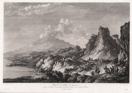 Veduta pubblicata nel ' Voyage Pittoresque ou description des Royaumes de Naples et de Sicile, opera in 5 volumi per la prima volta stampati a Parigi tra 1781 e il 1786. Richard de Saint-Non conobbe, durante il suo viaggio a Roma, i due già celebri pittori francesi Jean Honoré Fragonard e Hubert Robert, con i quali prosegue il suo viaggio per tutto il paese. Da questa grande amicizia nasce l’idea e la collaborazione per l’ambizioso progetto di documentare graficamente tutti i principali monumenti dell’Italia Meridionale e della Sicilia. Da qui, tra il 1781 ed il 1786, con l’aiuto di numerosi ed importanti architetti, pittori ed incisori, venne alla luce il ' Voyage Pittoresque ou description des Royaume de Naples et de Sicilie, opera composta di cinque volumi che uscirono annualmente. Incredibile sforzo tipografico, l’opera raccoglie quasi per intero gli appunti di viaggio del Saint-Non, adeguatamente assemblati e corretti; il corpus grafico è composto di ben 542 incisioni all’acquaforte e bulino, opera dei principali artisti di riproduzione del periodo. Da un punto di vista editoriale l’iniziativa riscuote immediatamente un grandissimo successo: il libro diviene un vero e proprio modello tipografico, sul quale sono basate diverse pubblicazioni dell’impero napoleonico. Dal punto di vista artistico le vedute, i paesaggi e le rovine conservano, e non può essere altrimenti, lo stile pittorico e romantico del Fragonard, del Robert, del Desprez, e di tutti gli altri artisti che collaborano nella realizzazione di questa monumentale opera. Il notevole successo commerciale della raccolta è testimoniato dalla ristampa, tra il 1795 ed il 1798, delle sole tavole pittoriche. Un’ulteriore edizione è stampata nel 1829 dal Dufour. Esemplare tratto dal ' Voyage Pittoresque, ' prima edizione con l’acronimo del privilegio reale. ' Acquaforte, stampata su carta vergata coeva, in ottimo stato di conservazione. View taken from the ' Voyage Pittoresque ou description des Royaume de Naples et de Sicilie ' by Richard de Saint-Non. During his trip to Rome, Richard de Saint-Non met two already famous French painters, Jean Honoré Fragonard and Hubert Robert, with whom he travelled along Italy. Their friendship led to the cooperation for the ambitious project of depicting all the main monuments of Southern Italy and Sicily. Between 1781 and 1786, with the assistance of many contemporary artists, he realized the ' Voyage Pittoresque ou description des Royaume de Naples et de Sicilie, a five volumes work published annually. As a result of a great typographical effort, the work is a collection of Sain-Non’s travelling notes; the graphic part is made up of 542 engravings and etchings, realized by the most important artists of the period. The work is immediately successful, for the book became a new typographical model for the following publications. From an artistic point of view, the views, landscapes and antiquity keep the Romantic pictorial style of Fragonard, Robert, Desprez and all the other artists that took part in this monumental project. The re-issue, between 1795 and 1798, of the pictorial plates, witnesses the great success of this project. A re-issue of the whole work was edited in 1829 by Dufour. Example taken from the first edition of the work, with the acronym of the Royal priviledge. ' Etching, printed on contemporary laid paper, in good condition. Cfr.